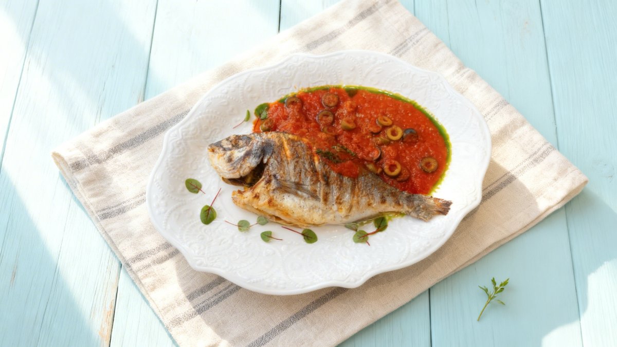 Sea bass, zucchini, lemon, spices (thyme, tomatoes and olives, black pepper), cilantro