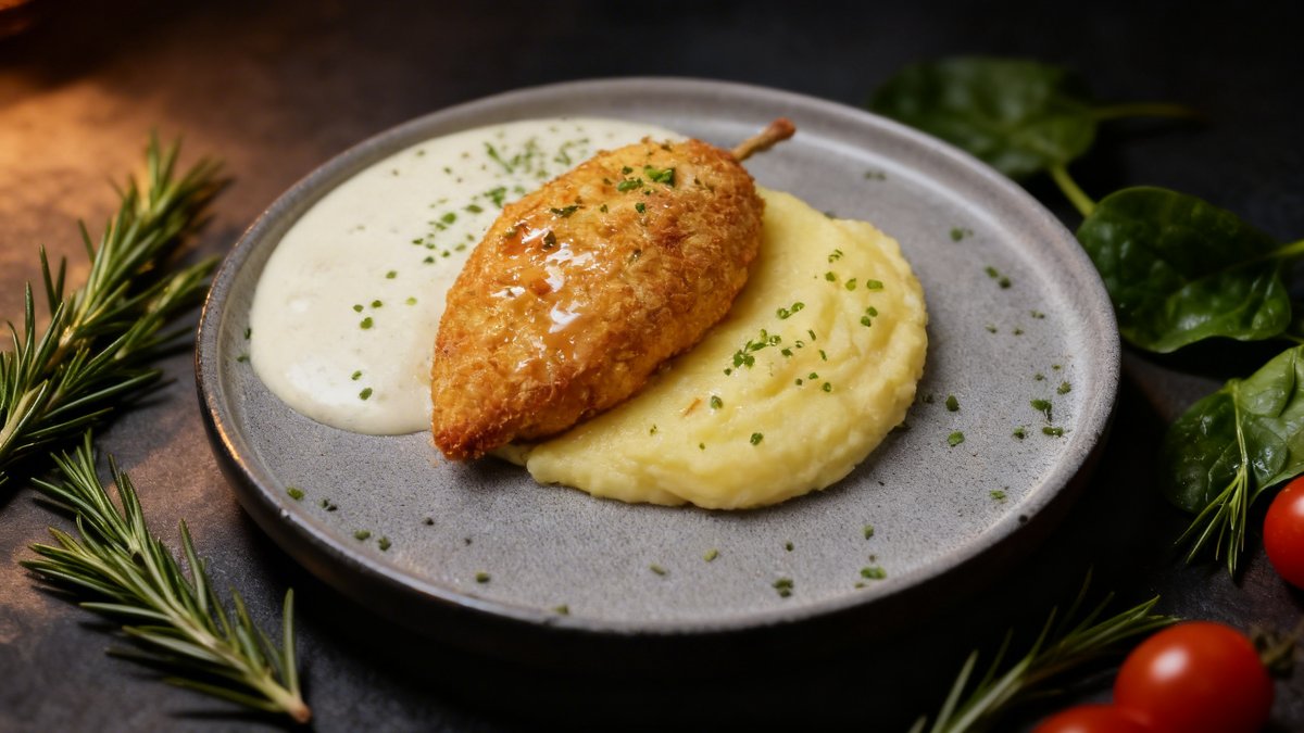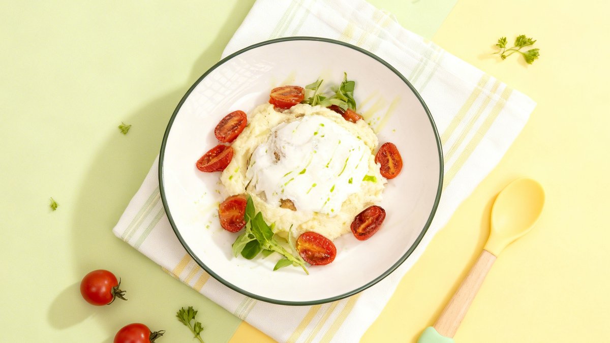 Chicken fillet, mashed potatoes, butter, milk, cheese mousse, cherry tomatoes
