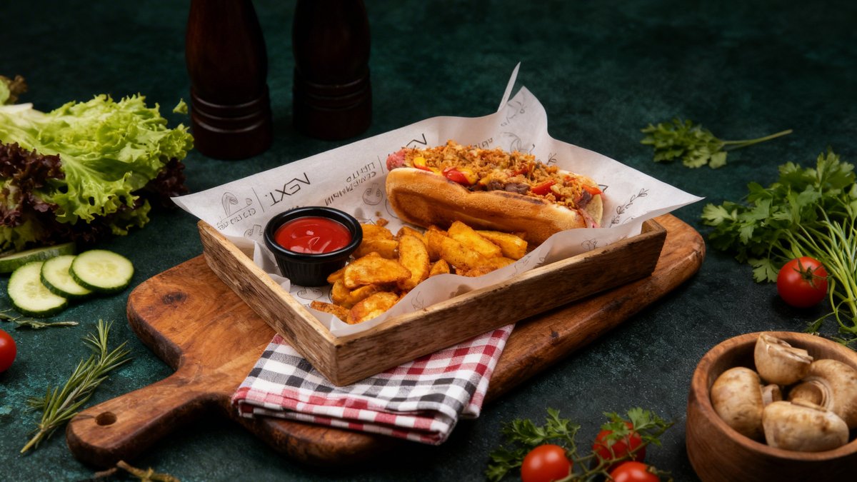 Burger bun, BBQ sauce, pickles, beef patty, cheddar cheese, mushroom julienne (onion, champignons, cream, spices), sweet mustard, potato wedges, ketchup