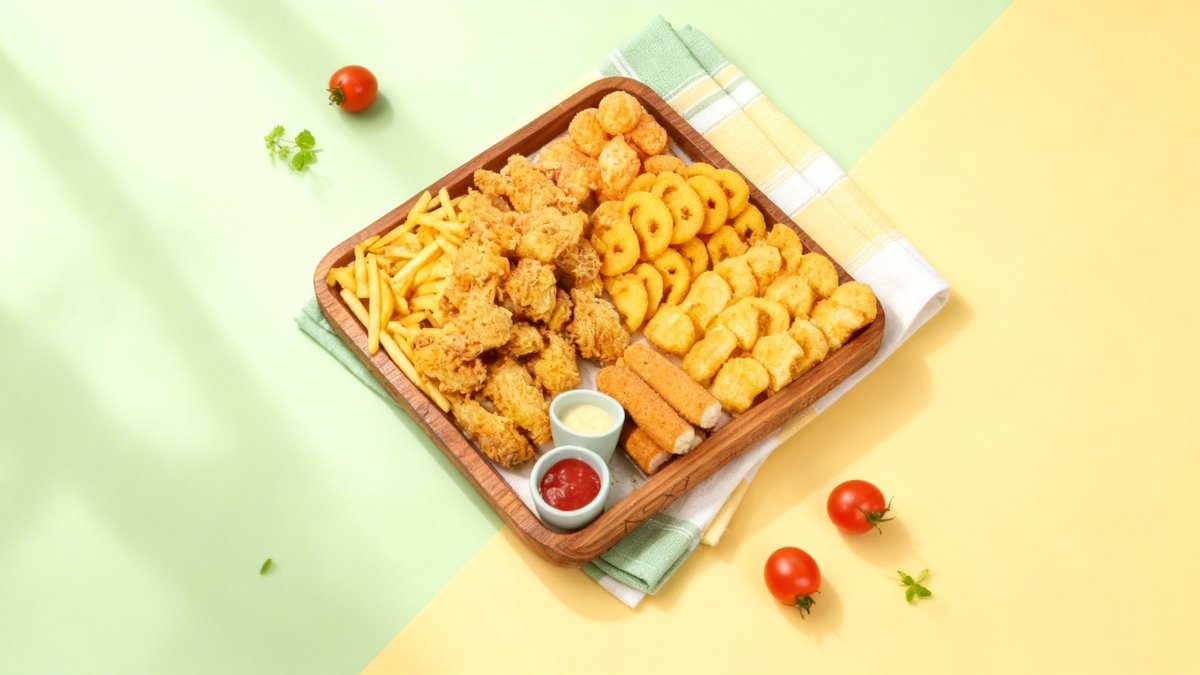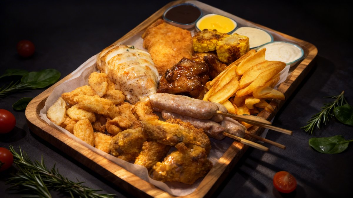 Crispy chicken wings, French fries, chicken nuggets, cheese sticks, potato smileys, grilled chicken sausages, cheese balls, cheese sauce, ketchup