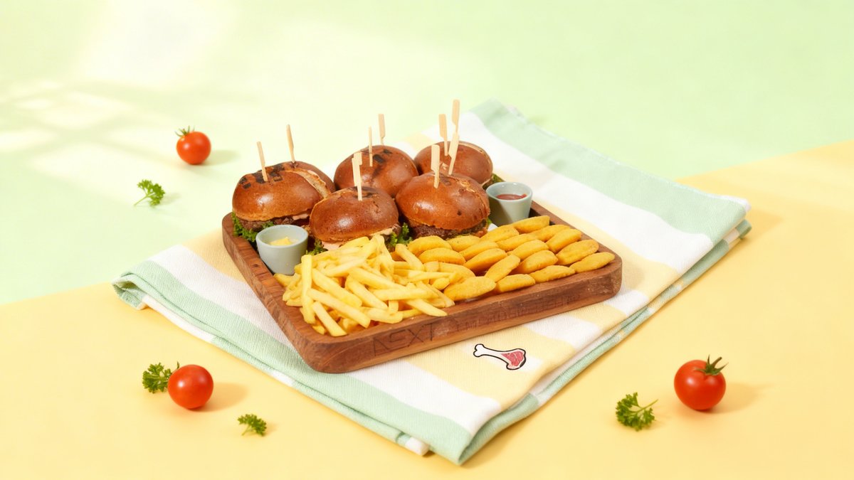5 mini burgers with a beef patty, cut in half, served with fries, potato smileys, cheese sauce, and ketchup