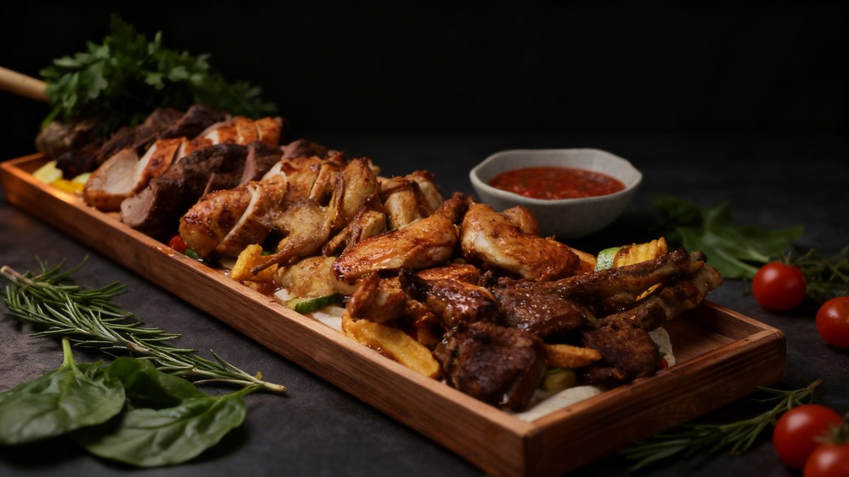 Beef tenderloin, chicken fillet, lamb entrecote, chicken marinated with adjika, lamb shank, horse tenderloin, grilled vegetables (zucchini, bell pepper, red onion), tortilla, meat sauce (ketchup, barbecue sauce, onion, herbs), butter