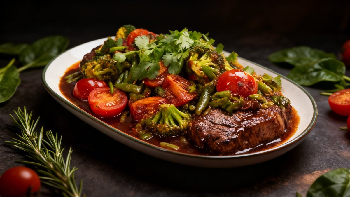 Marinated ossobuca, tomato paste, wine marinade, teriyaki sauce, sunflower oil, spices (thyme, salt, pepper, garlic), broccoli, red tomatoes, green beans, cilantro