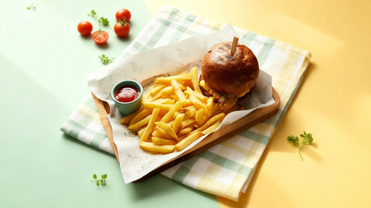 Burger bun, pickle, chicken fillet, breading, mustard sauce, served with French fries