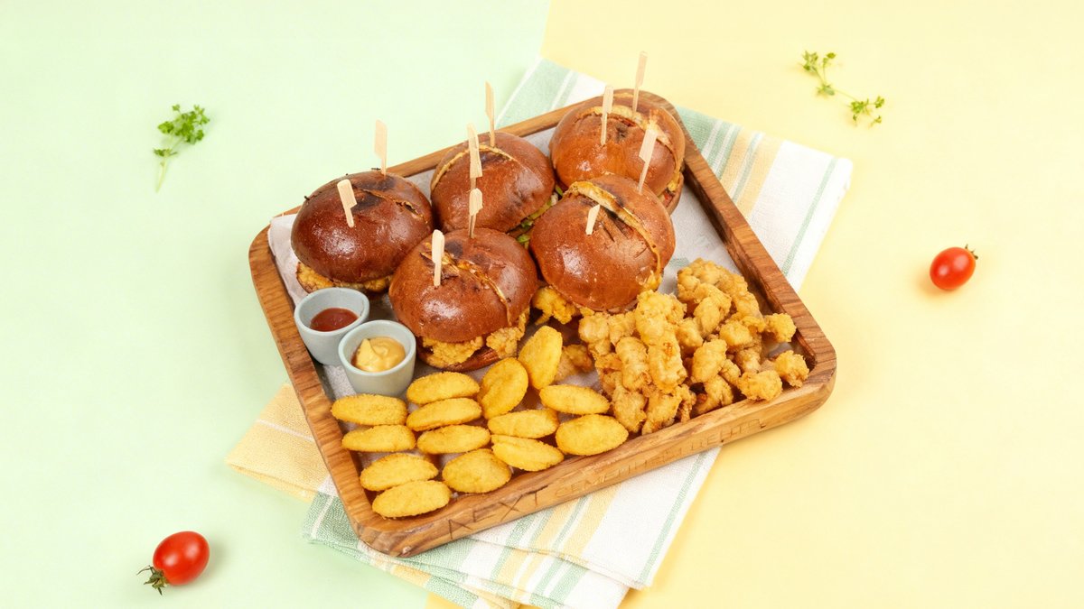 Burgers with crispy chicken breast, potato smileys, and chicken popcorn