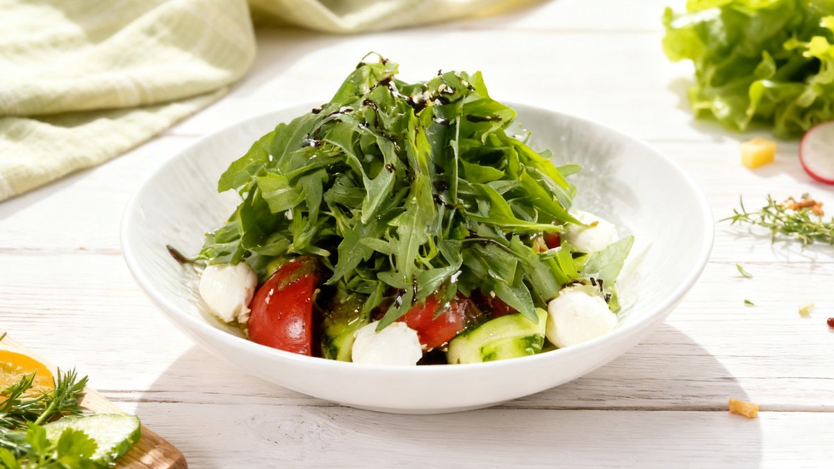 Eggs (3 pcs.), chicken sausages, lettuce salad, fresh vegetables (cucumbers, tomatoes), dressing (vegetable oil)