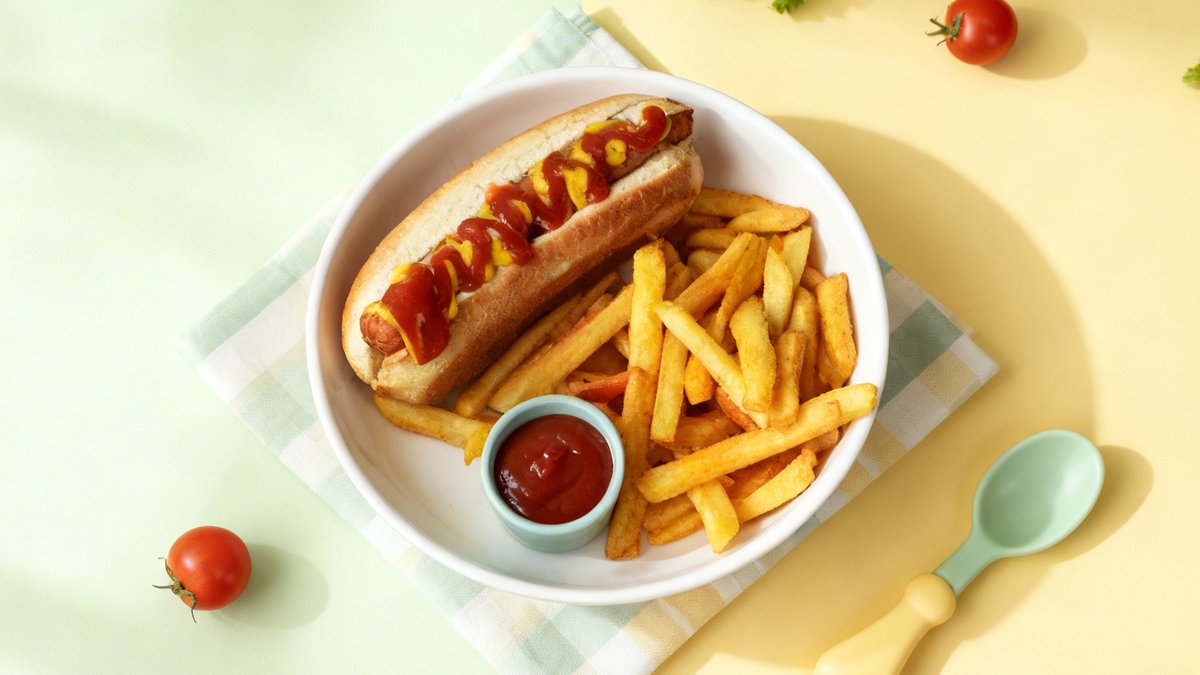 Hot dog bun, ketchup, chicken sausage, fried onions, mustard sauce