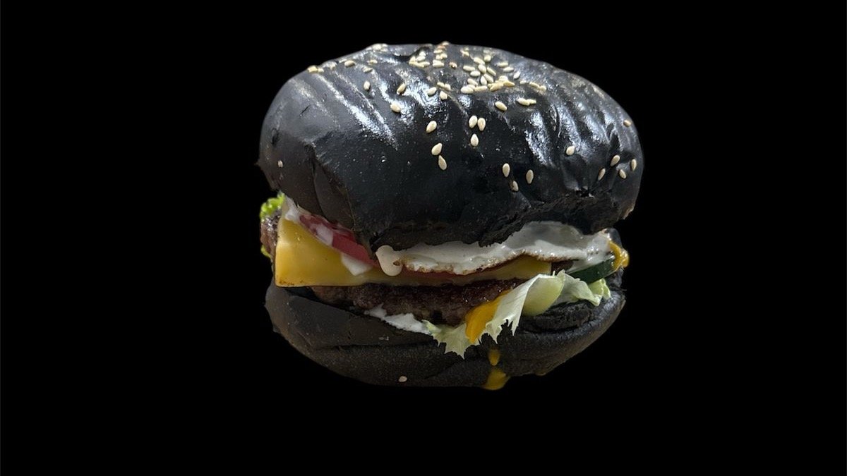 Котлета говяжья , листья салата, помидоры, огурцы, фирменный соус, сыр, яйцо сыр