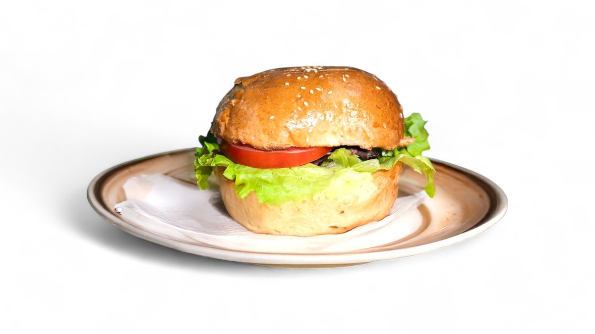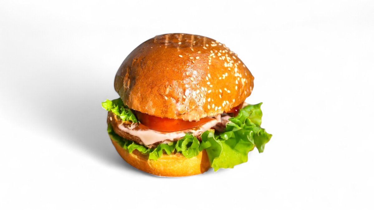 говяжья котлета, бриошь,листья салата, свежие огурцы, помидоры, фирменный соус