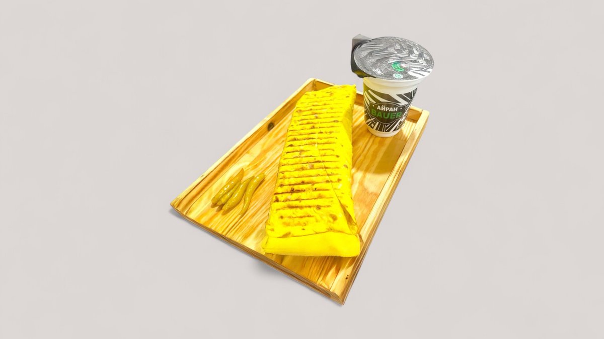 Лаваш сырный , курица на гриле , фри, помидоры,свежие огурцы, соусы,