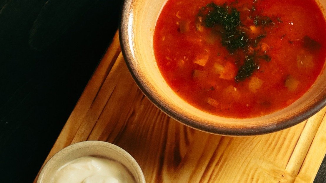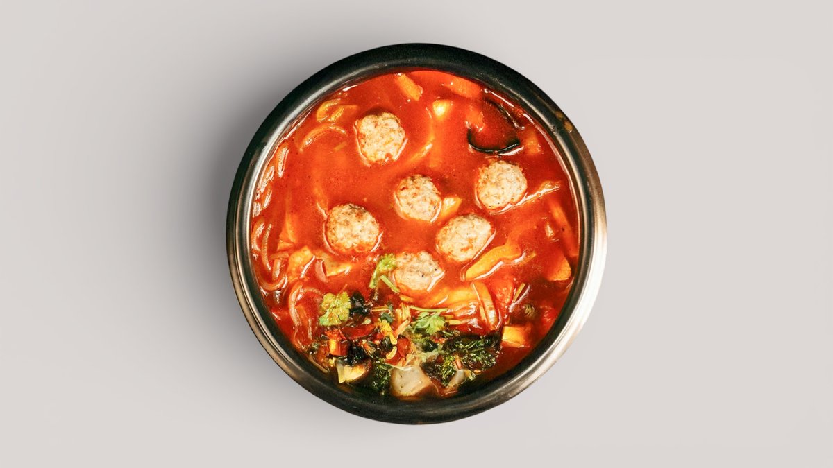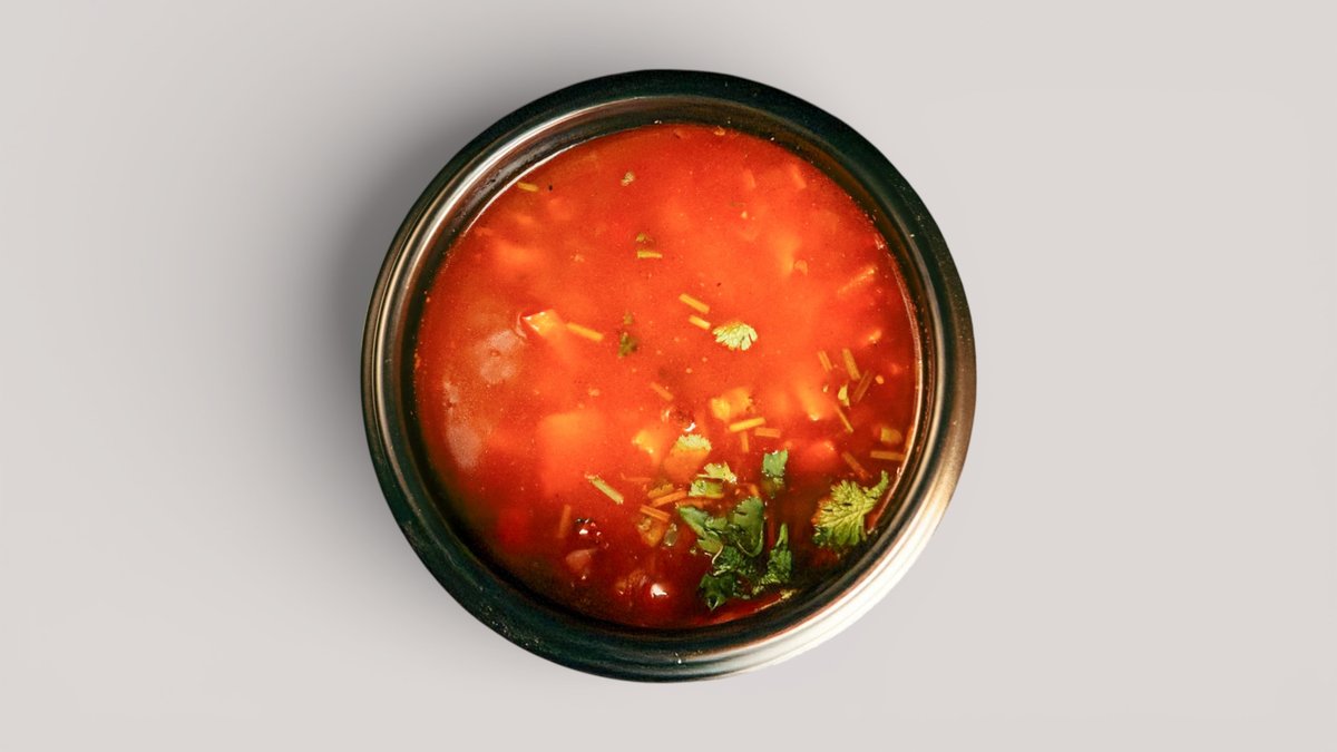 Полуострый красный суп с тестом и сочной говядиной.