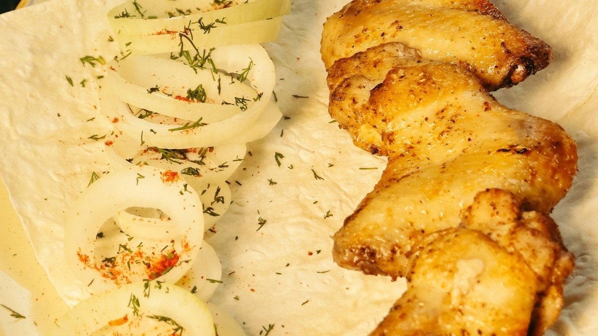 Румяные куриные крылышки с насыщенным вкусом, приготовленные на мангале. Подаётся с лавашем, маринованным луком и соусом.