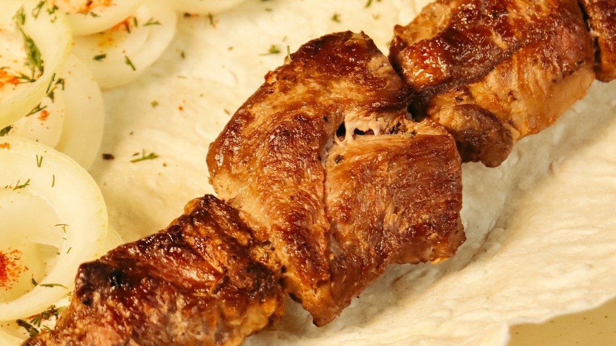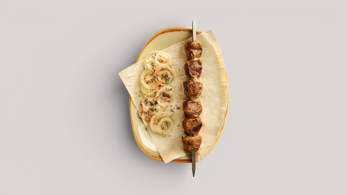 Сочный шашлык из куриного филе, приготовленный на углях. Подаётся с лавашем, маринованным луком и соусом.