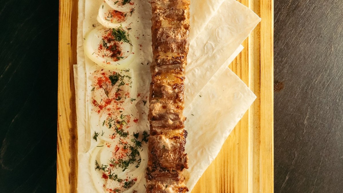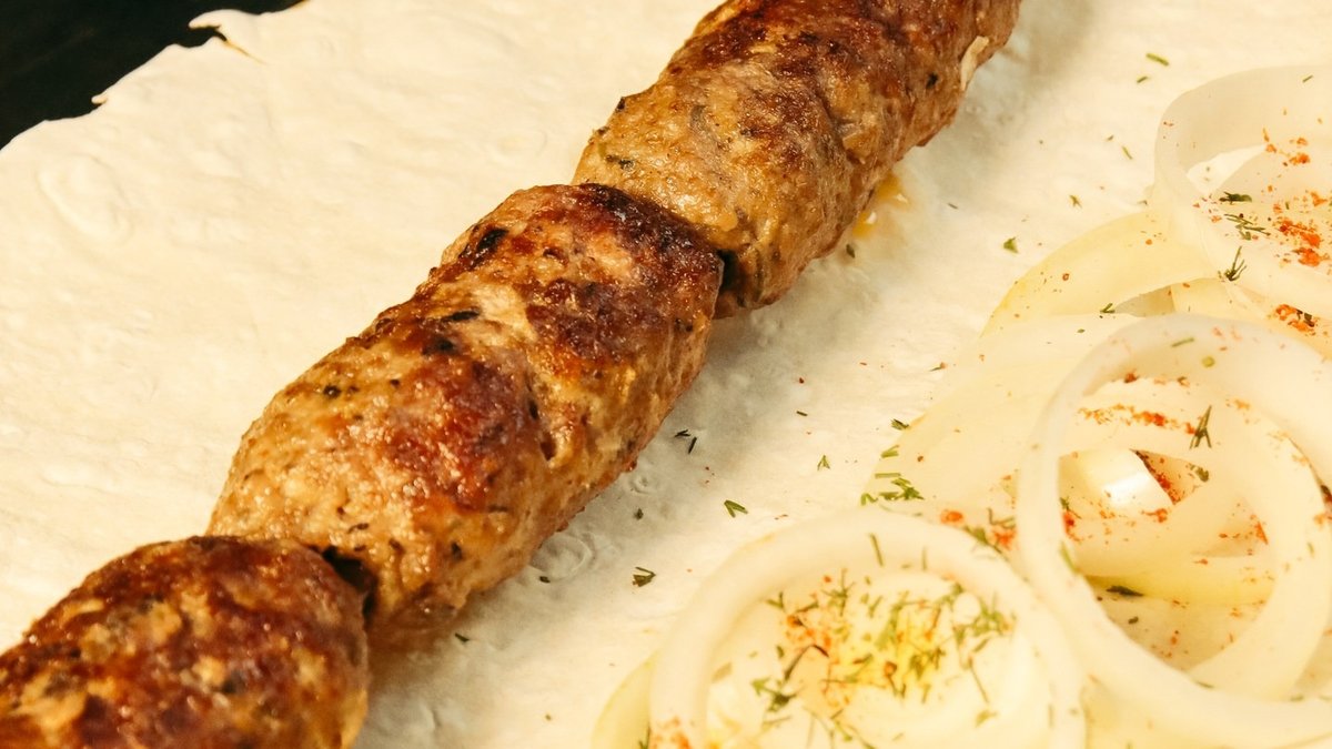 Сочный люля-кебаб из рубленого мяса, приготовленный на мангале. Подаётся с лавашем, маринованным луком и соусом.