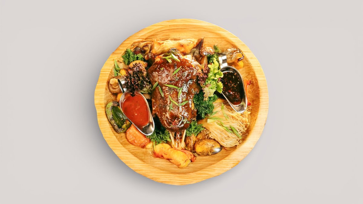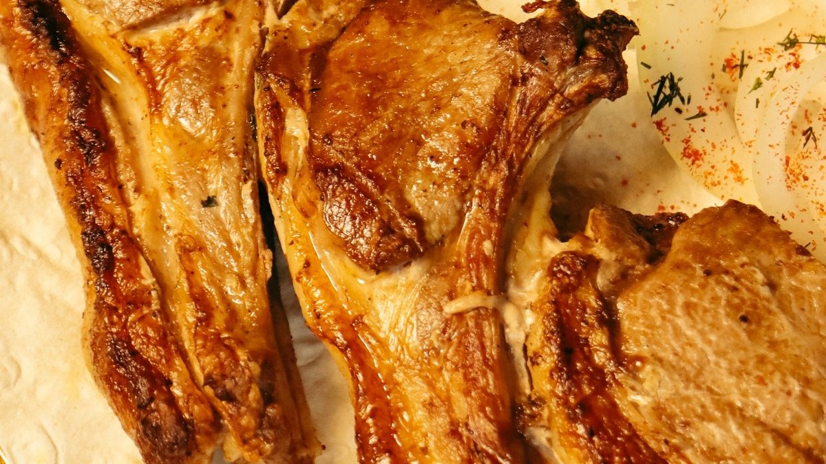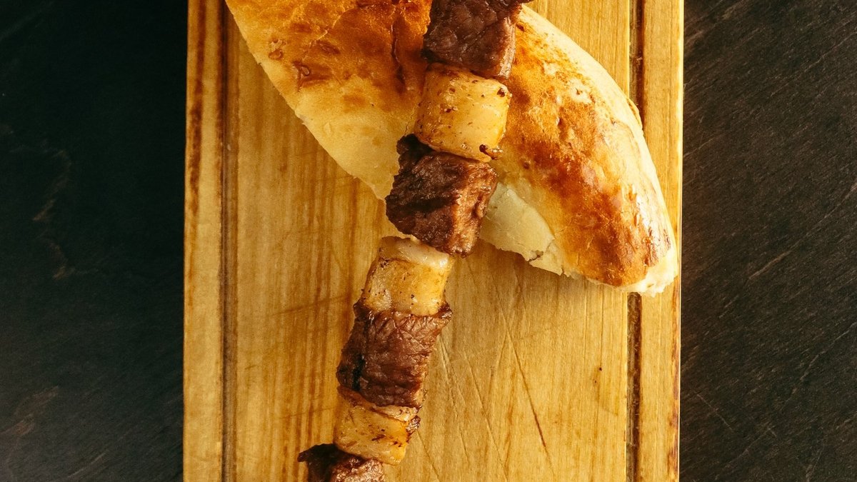 Антрекот с насыщенным мясным вкусом, приготовленный на углях. Подаётся с лавашем, маринованным луком и соусом.