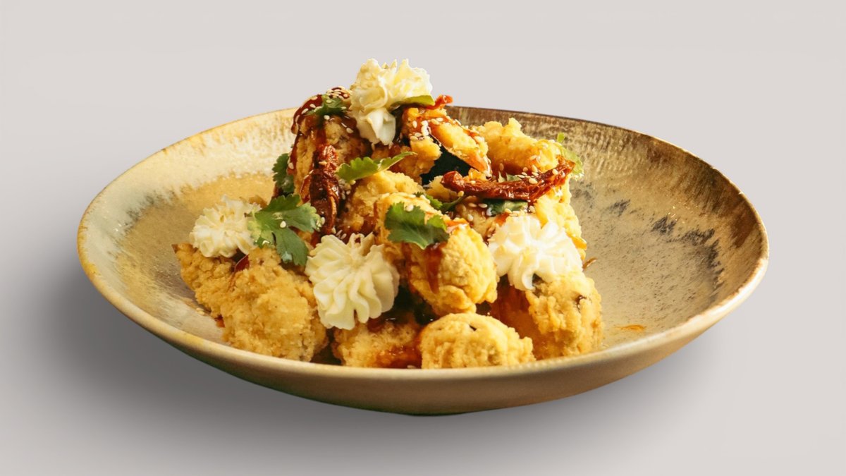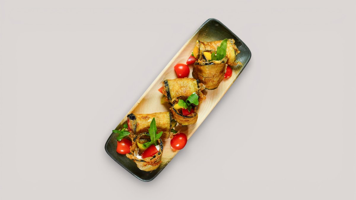 Хрустящий баклажан в кляре с вялеными томатами, крем-чизом, зеленью и кунжутом под соусом свит-чили с соевыми нотами.