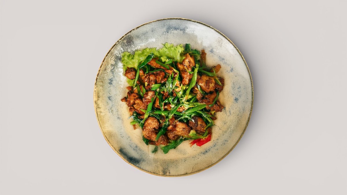 Куриное филе, обжаренное с полугорьким перцем, чесноком и имбирём в устричном соусе с кунжутным маслом.