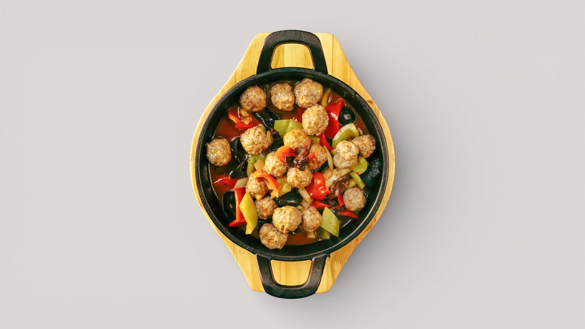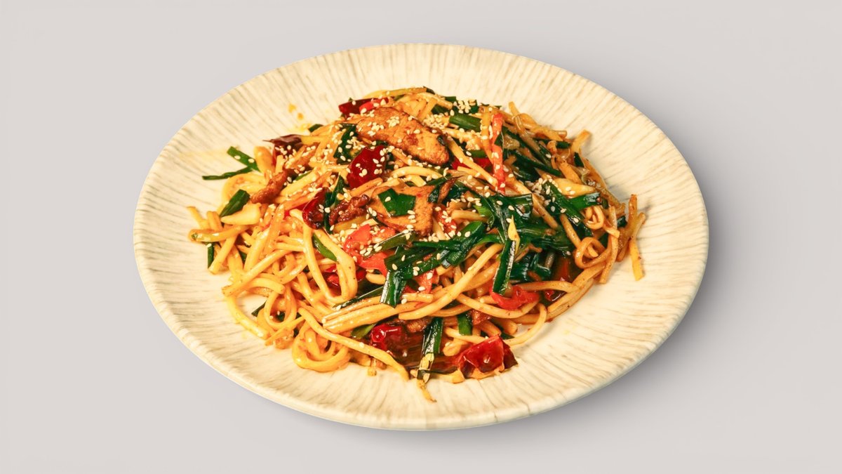 Обжаренная лапша с крупно нарезанным мясом и овощами в насыщенном азиатском соусе.
