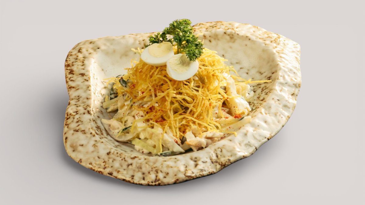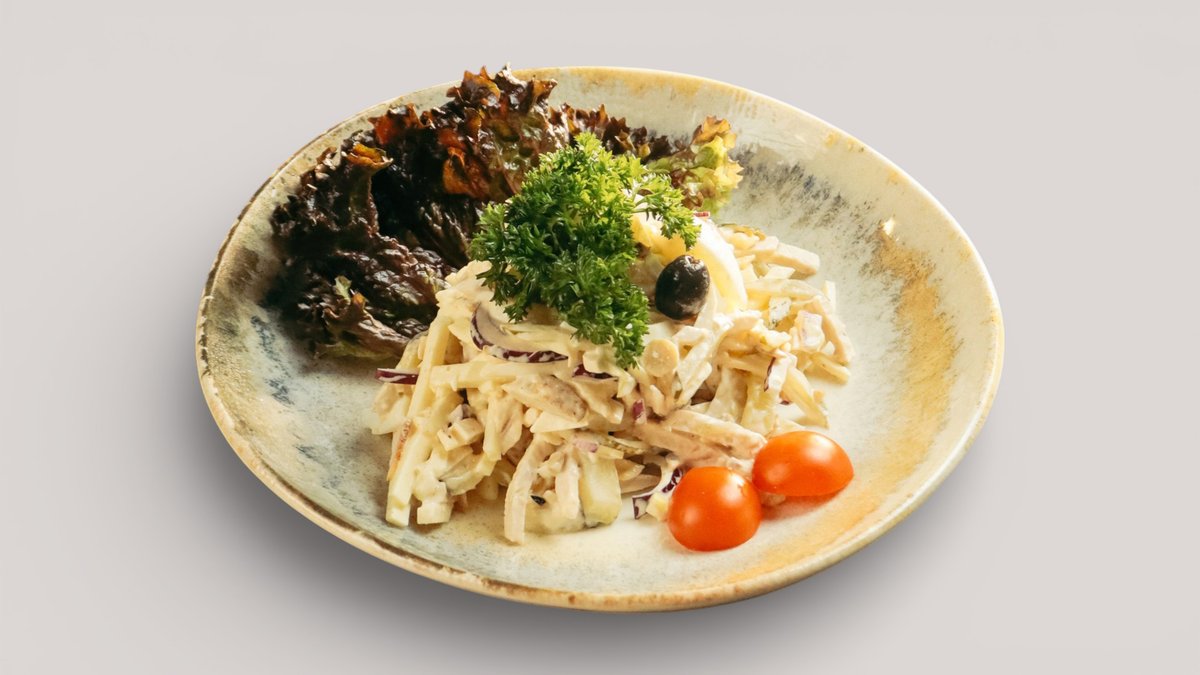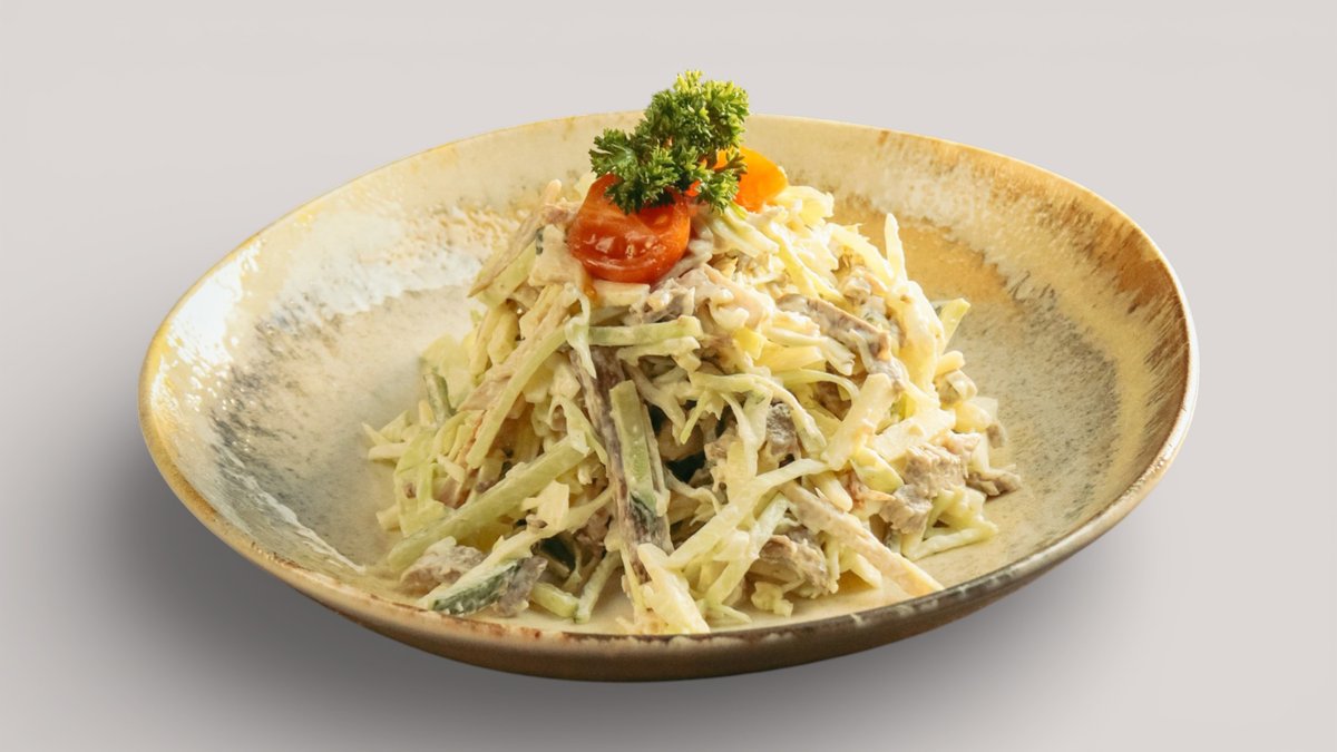 Салат с куриным филе, свежими и маринованными огурцами, отварным яйцом под нежным майонезом, с картофелем пай и перепелиным яйцом.