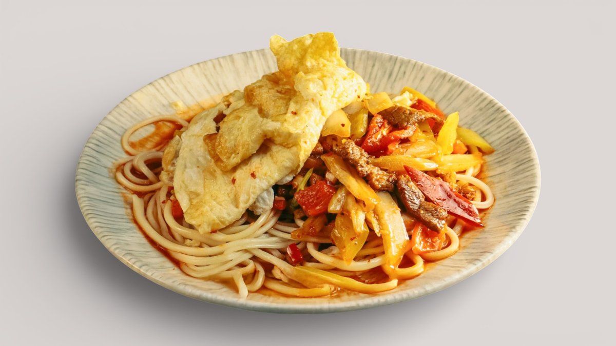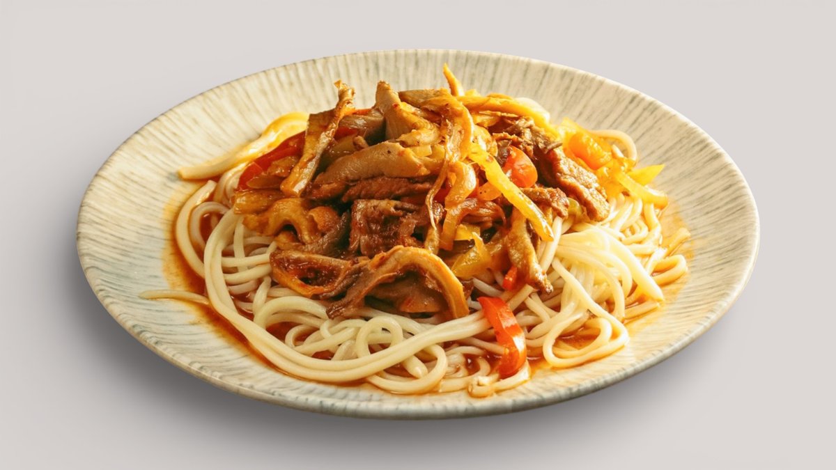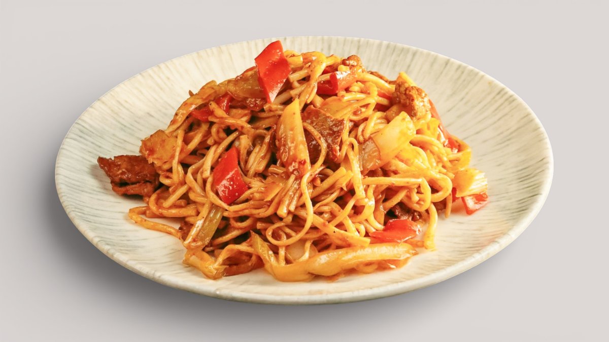 Обжаренная лапша с сочным мясом, овощами и ароматным джусаем в насыщенном соусе с азиатскими специями.