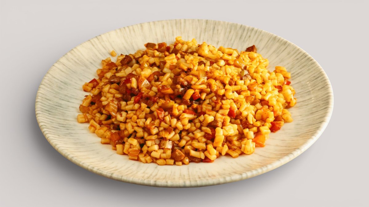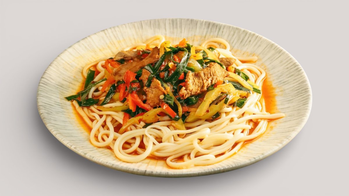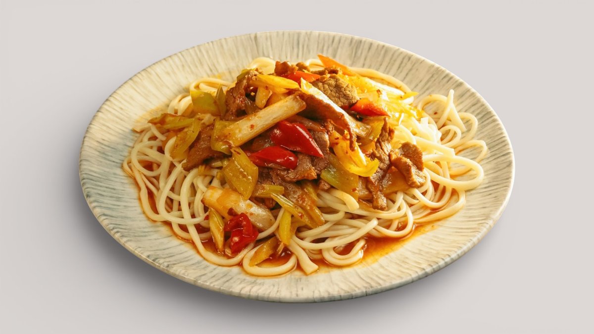 Лагман с мелко нарезанным мясом и овощами, приготовленный в ароматном соусе с пряными нотами.