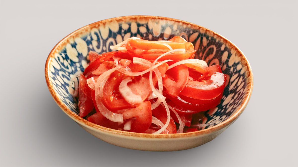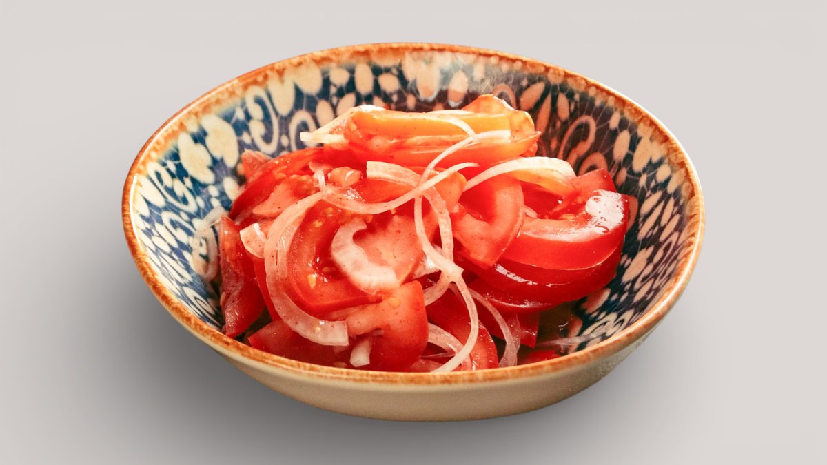Сочные помидоры с репчатым луком, полугорьким перцем, халапеньо, солью, чёрным перцем и паприкой.