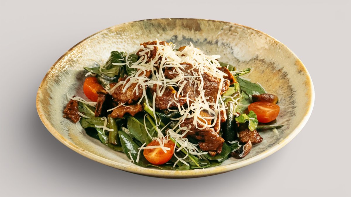 Маринованная телятина с шампиньонами, стручковой фасолью, томатами черри, шпинатом и пармезаном под соево-масляной заправкой.