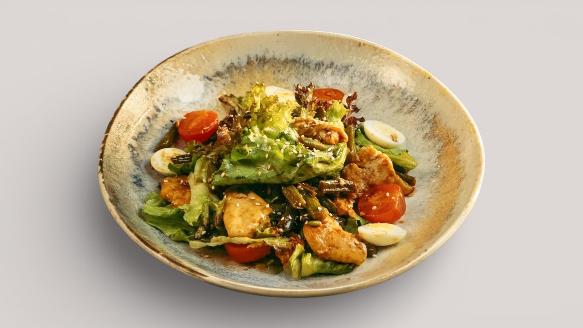 Куриное филе в соусе терияки с томатами черри, стручковой фасолью, перепелиным яйцом, красным луком, кунжутом и салатными листьями