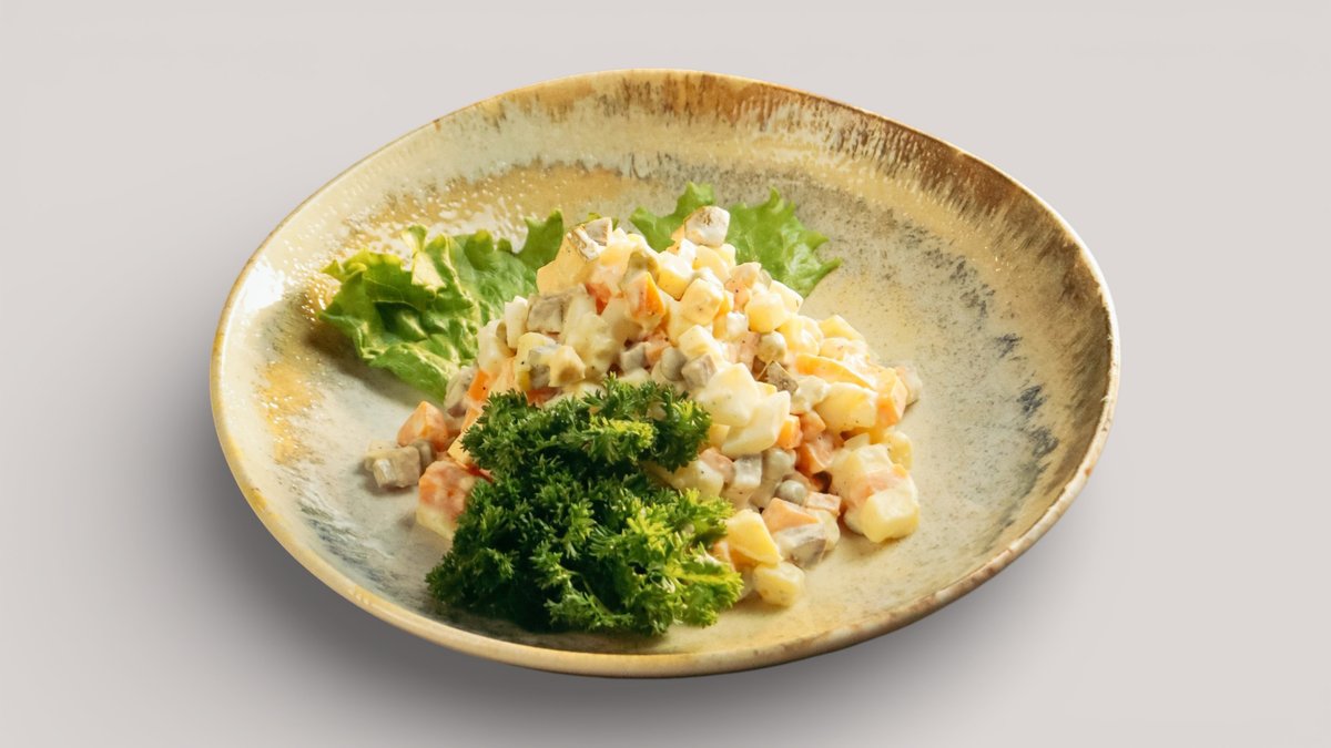 Классический салат с отварными овощами, яйцом, сочной говядиной, зелёным горошком и маринованным огурцом под нежным майонезом.
