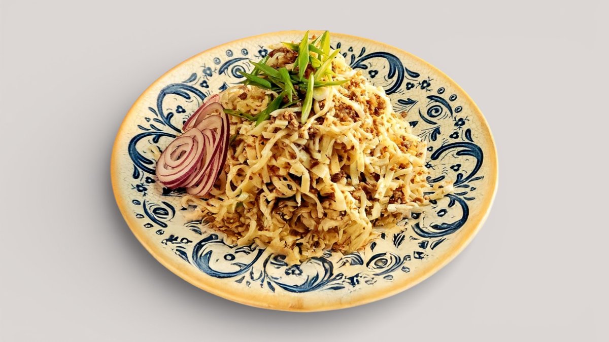 Обжаренная лапша с мелко нарезанным мясом и овощами в ароматном соусе с азиатскими специями.