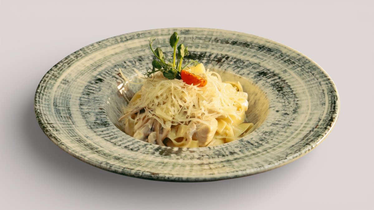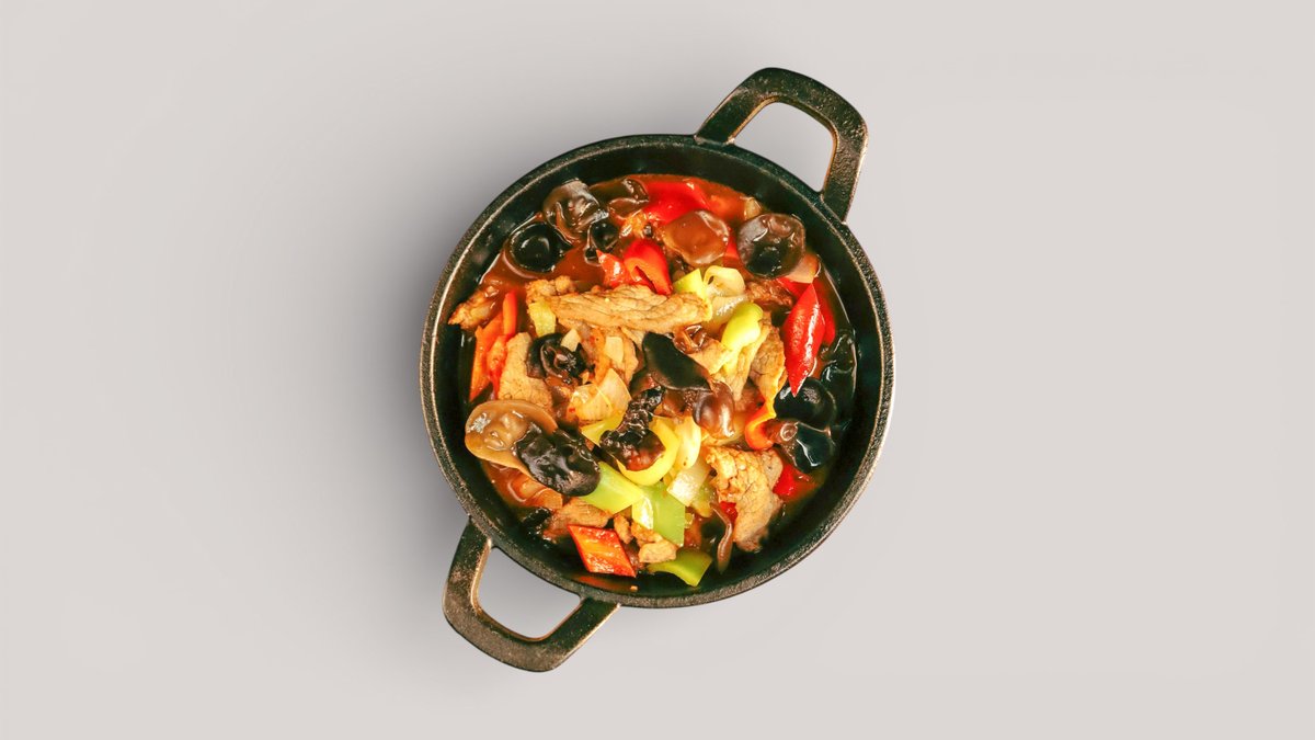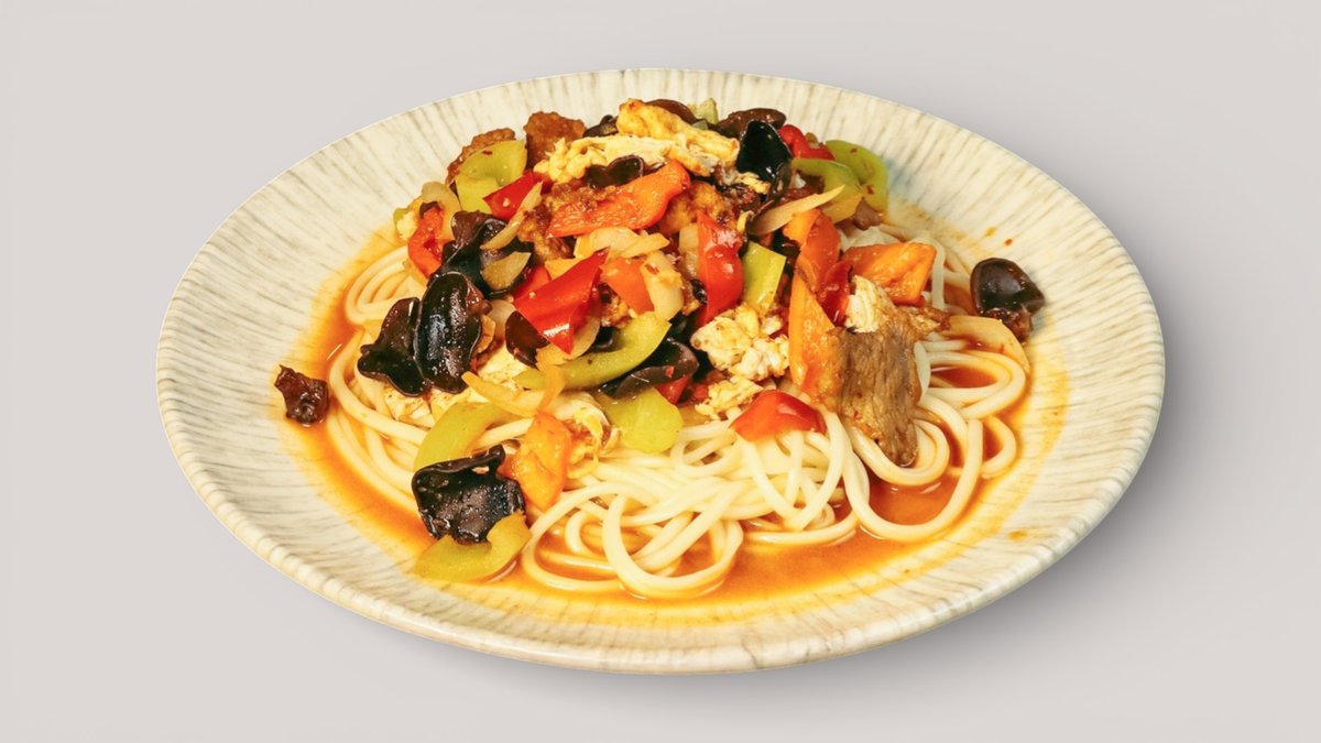 Обжаренная лапша с маринованным мясом и овощами, с добавлением древесных грибов, в ароматном азиатском соусе.