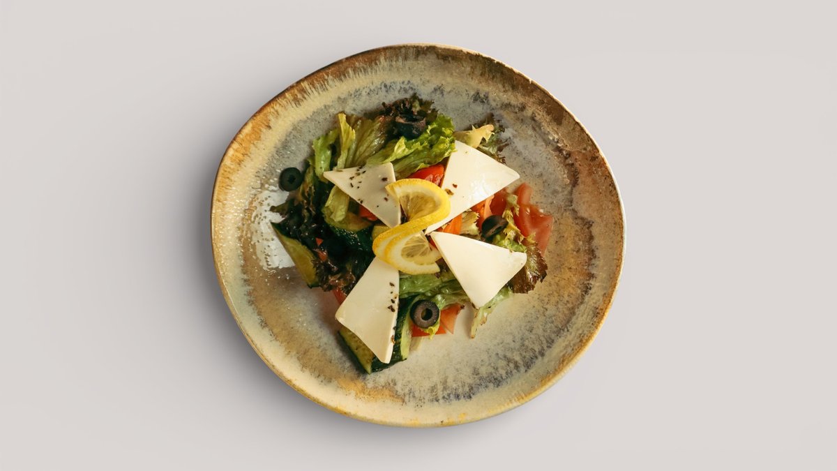 Свежие помидоры и огурцы, болгарский перец, маслины, сыр фетакса и микс салатных листьев под оливковым маслом и греческим соусом.