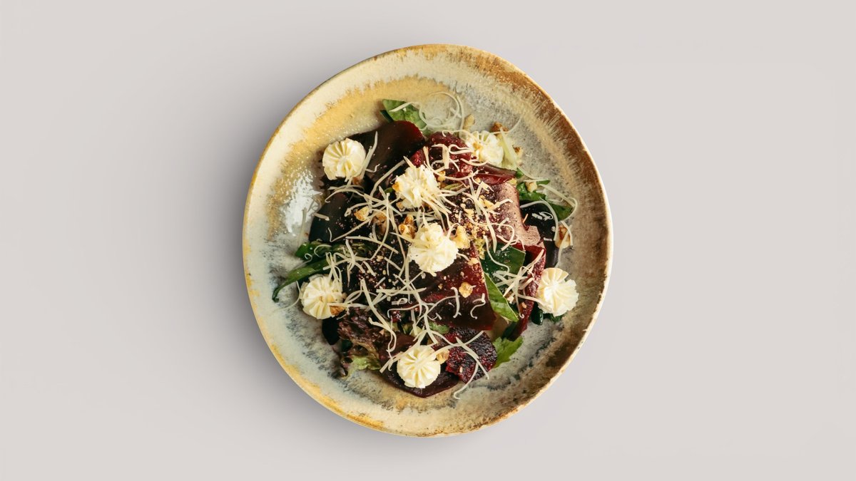 Микс салатных листьев со сладкой отварной свёклой, нежным творожным сыром, грецким орехом и пармезаном под медово-горчичным соусом.