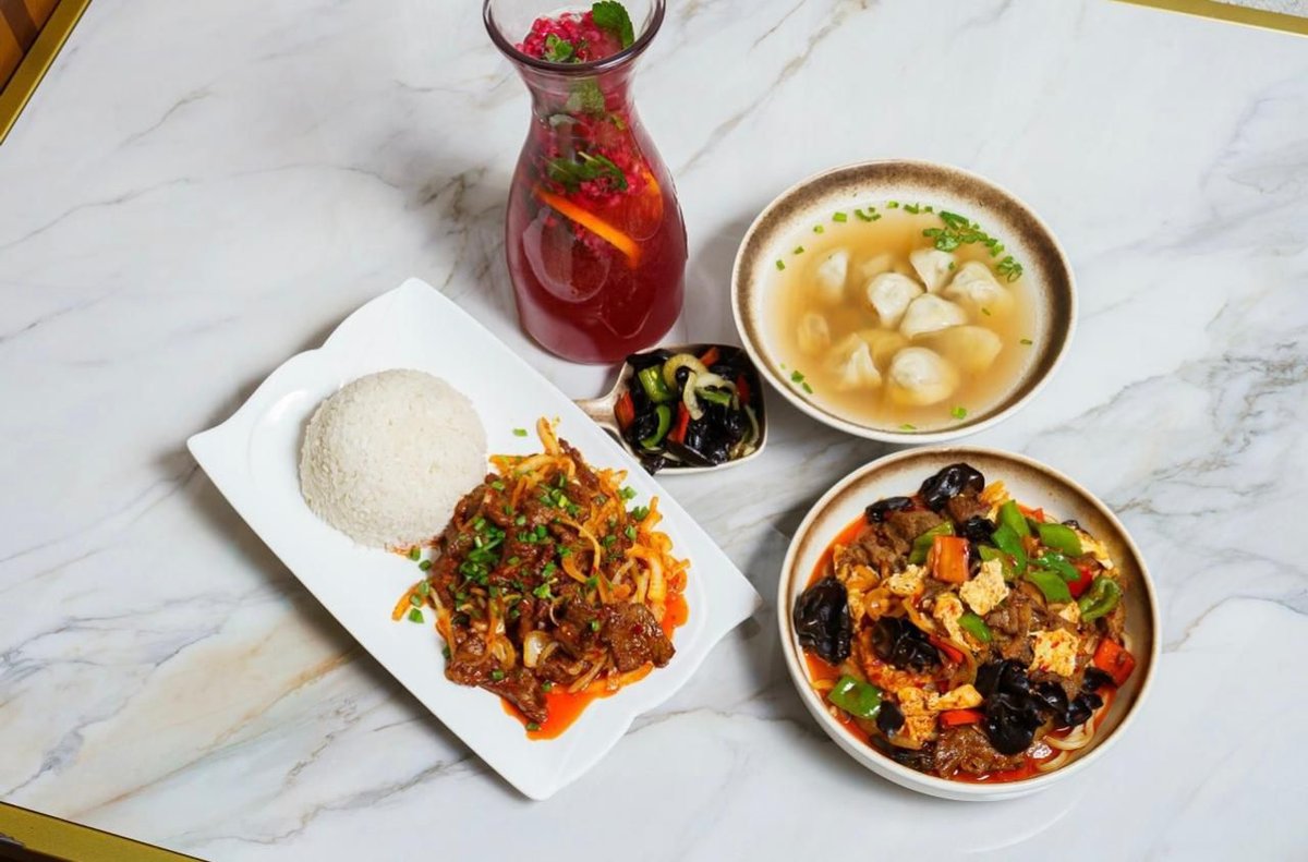 Казан кебаб из говядины с рисом, Мошуру лагман, фирменные пельмени с бульоном,салат на выбор, Ягодный лимонад 1л