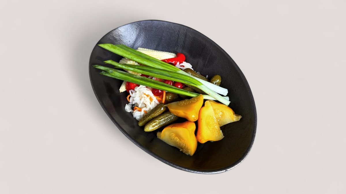 Ассорти солений из квашеной капусты с клюквой, патиссонов, корнишонов, маринованного перца и мини-кукурузы в початках. Подаётся с перьями зелёного лука.