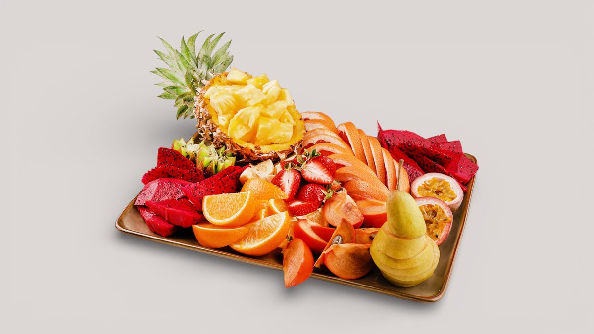 Нарезка из свежих фруктов: маракуйи, драгон-фрукта, ананаса клубники, грейпфрута, банана, апельсина, киви, груши и хурмы