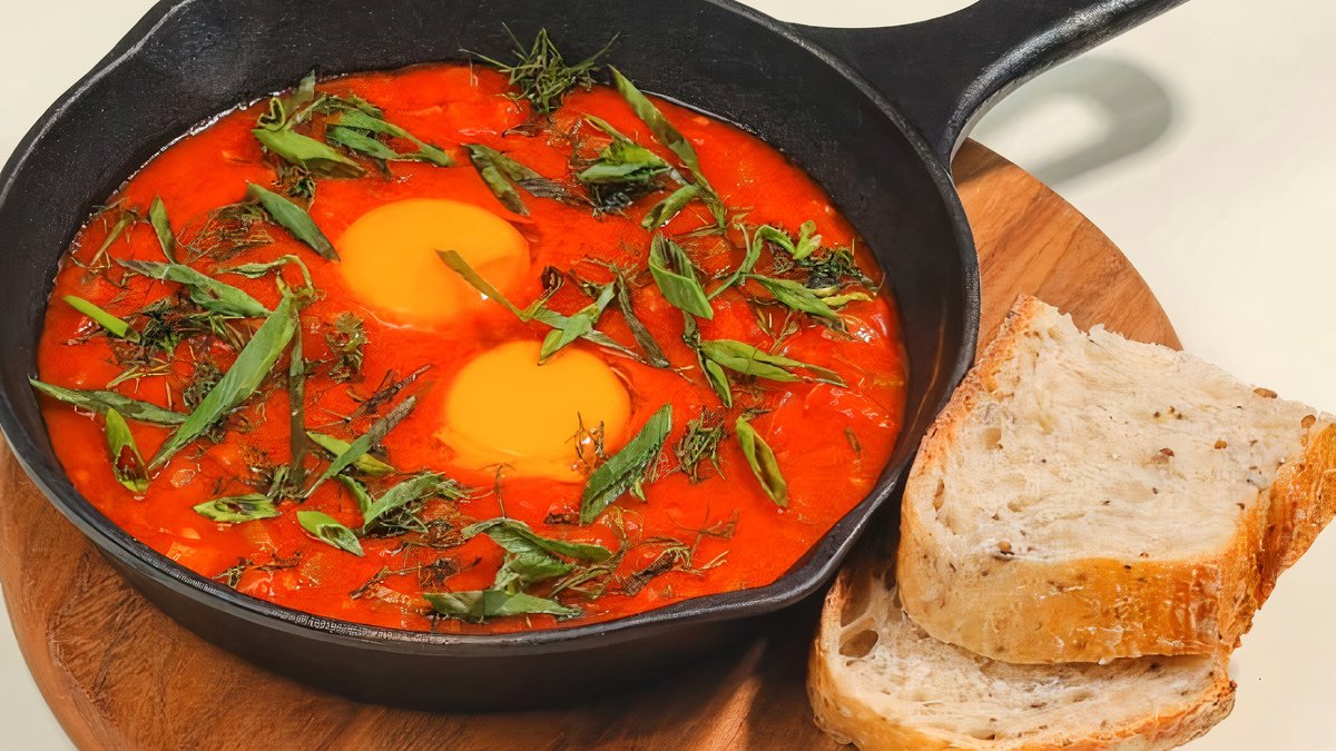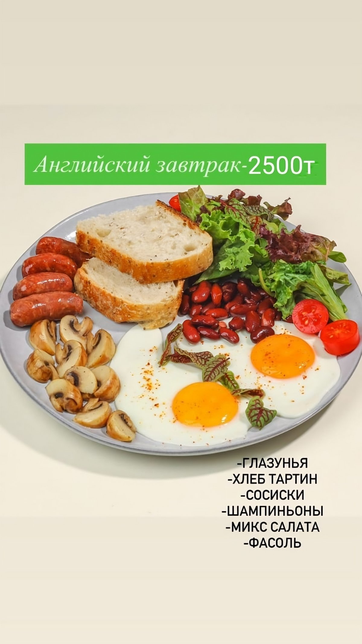 Глазунья, сосиски, фасоль, шампиньоны, микс салата, хлеб тартин
