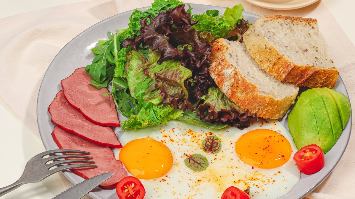 Глазунья, вяленое мясо, авокадо, микс салата и хлеб тартин