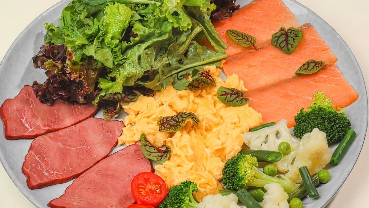 Скрэмбл, семга, вяленое мясо, овощи и микс салата