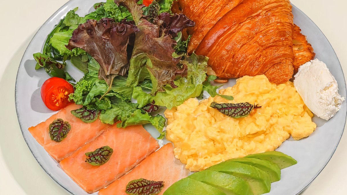 Скрэмбл, семга, авокадо, кремчиз, круассан, микс салата