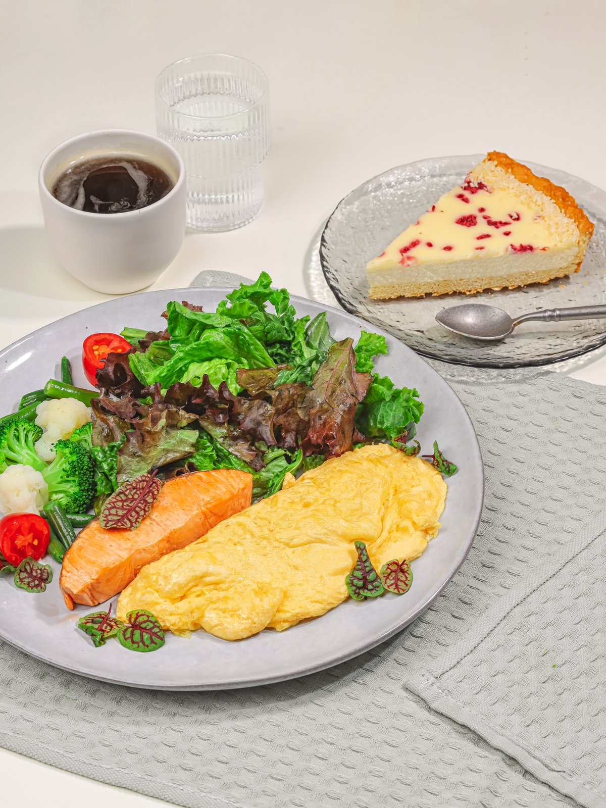 Омлет, семге, брокколи, цветная капуста, стручковая фасоль и микс салата