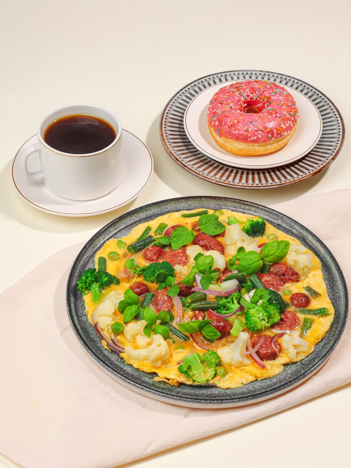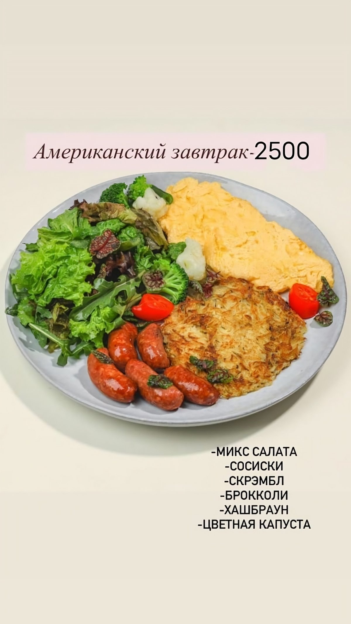 Скрэмбл, сосиски, кэшбраун, брокколи, цветная капуста, микс салата