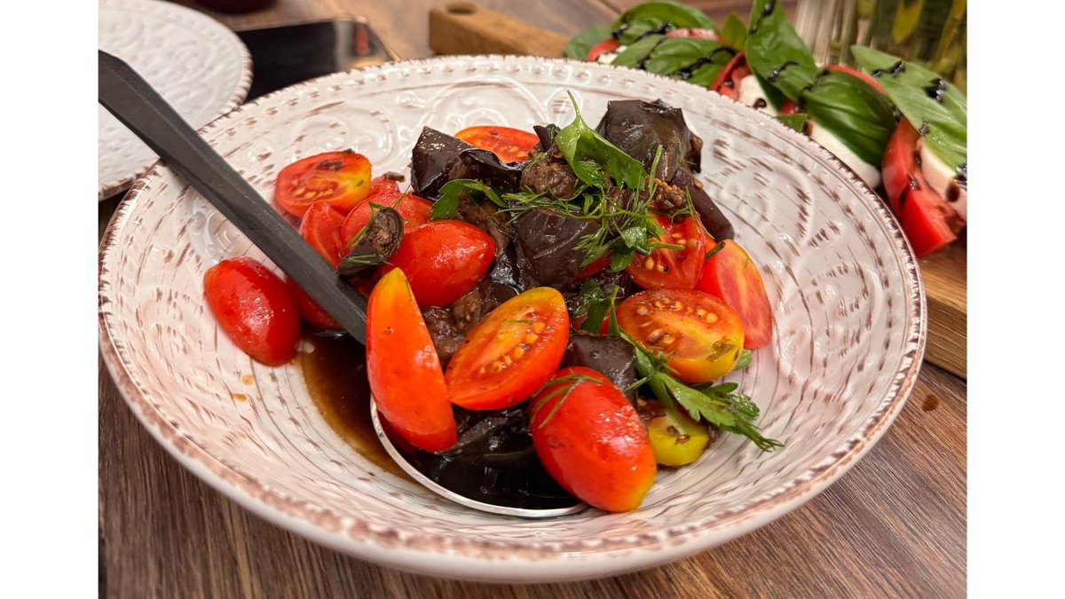 Обжаренные до золотистого цвета баклажаны, черри помидоры, заправленные соевым соусом с чесночком