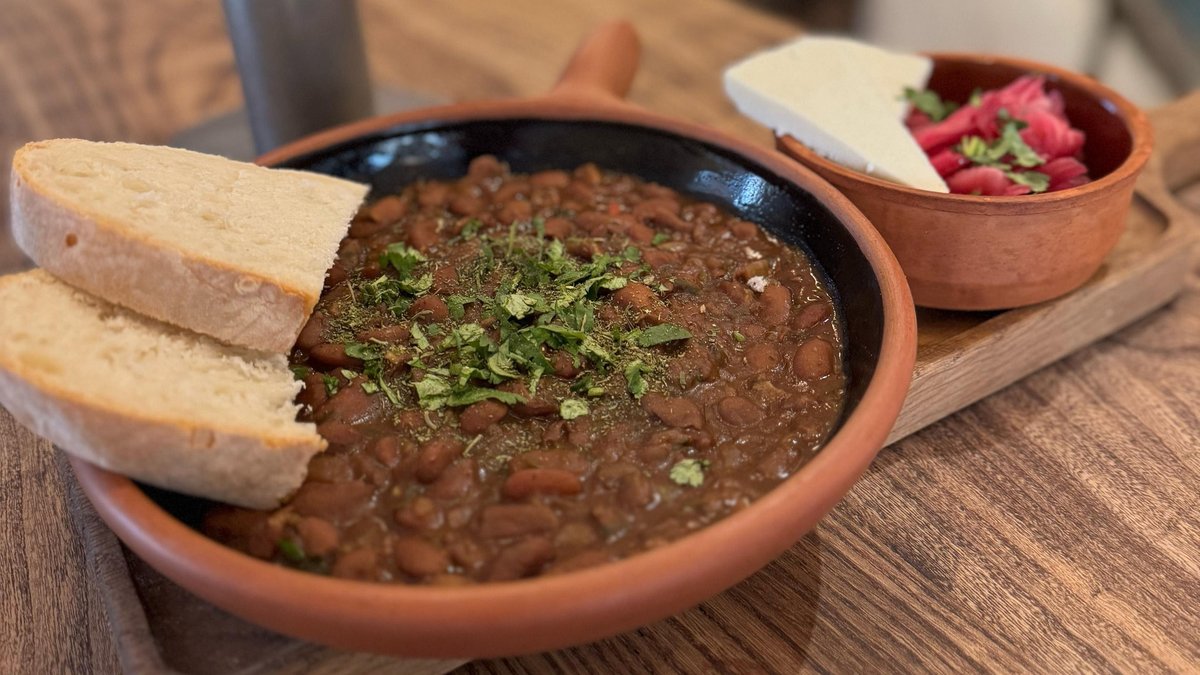 Красная фасоль тушеная с грузинскими специями. Подается с квашеной красной капустой, брынзой и кусочками хлеба
