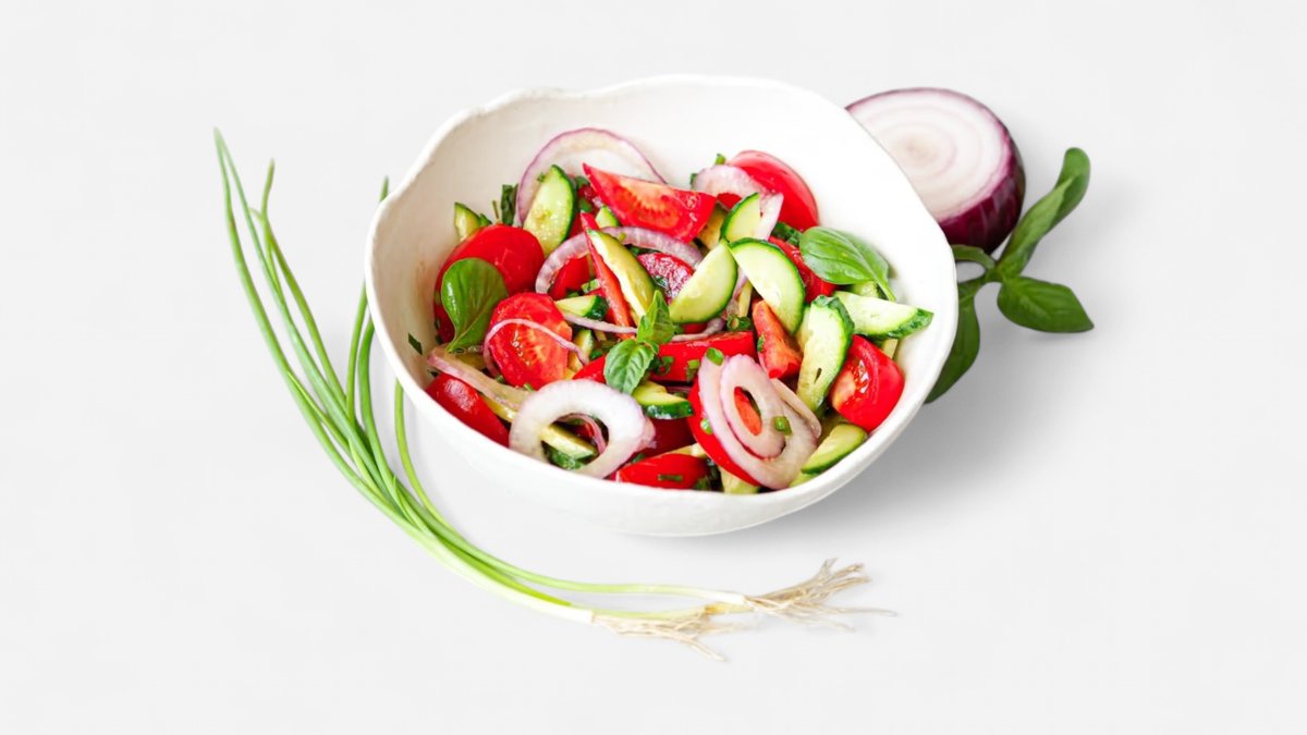 Помидоры, огурцы, болгарский перец-заправляется на выбор: сметаной, майонезом, ароматным маслом.