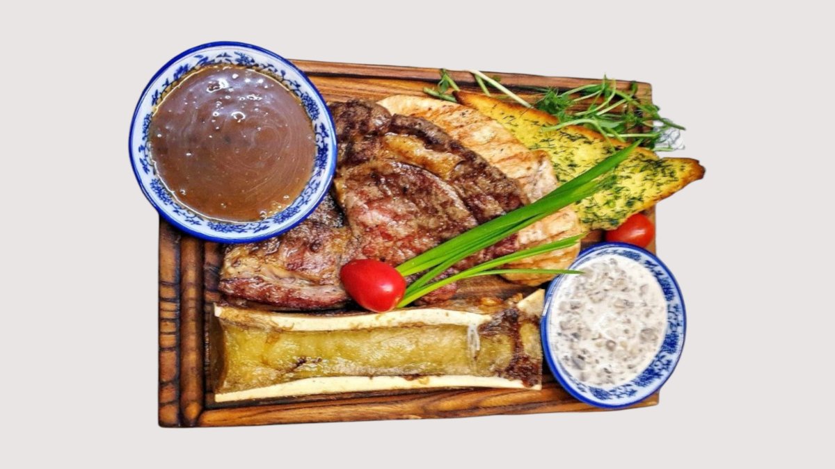 Малое мясное ассорти BBQ из стейка стриплойн,куриной грудки,мозговой косточки и чесночного хлебушка.Подаем с грибным соусом и соусом демиглас.