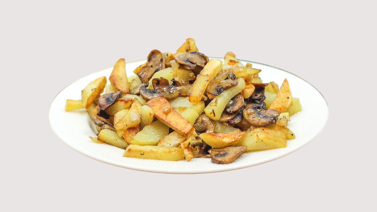 Сковорода жаренной картошки с мясом, грибами, луком и сыром. Подаем с квашенной капустой и бочковыми огурчикам