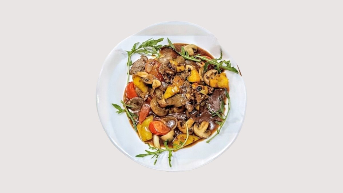 Конина BBQ, перепелиные яйца, черри, микс салата, под имбирным соусом.