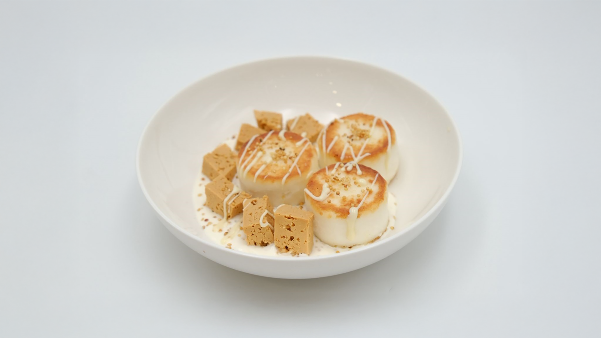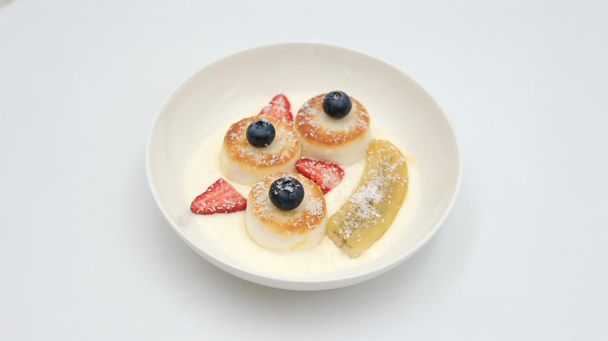 Сырники в оригинальной подаче, с иримшиком и тары в сливочном соусе