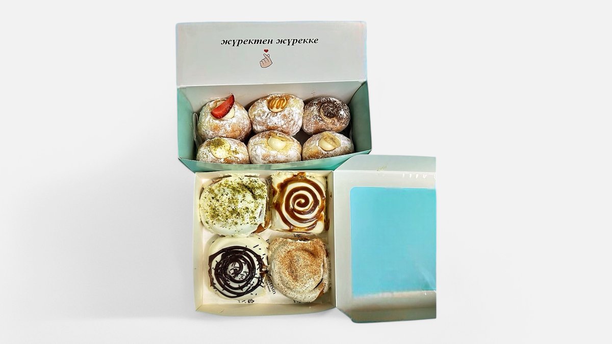 Бокс из 6 берлинеров – воздушные пончики с мягкой текстурой и сливочно-заварным кремом внутри. • Бокс из 4 синнабонов – ароматные булочки с различными начинками, пропитанные сгущенкой и политые разными видами шоколада.